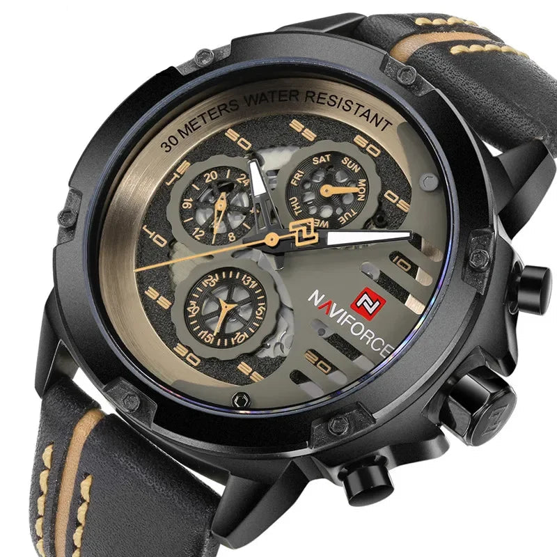 A watch that combines robustness with classic style, ideal for casual occasions and social settings. The genuine leather strap complements the sophisticated look.